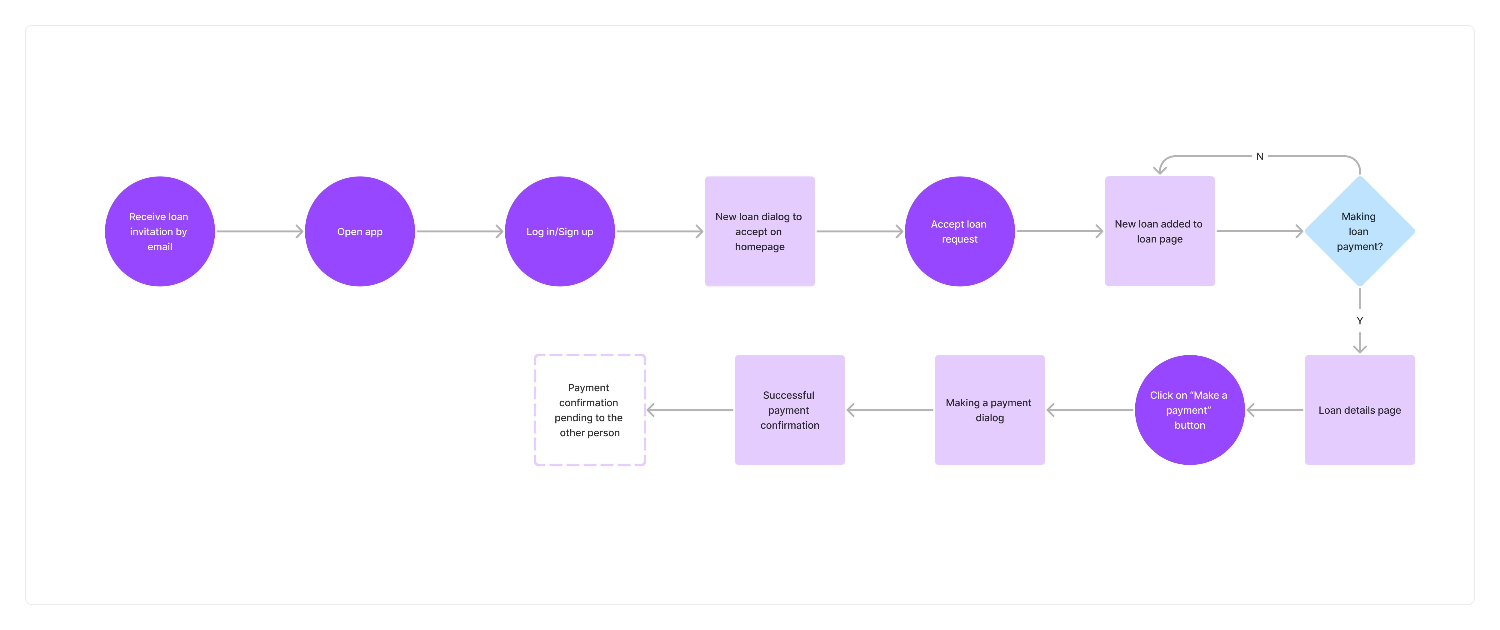 Loan Receiver and Making a payment: This flow shows how users will navigate through the steps of receiving a loan invitation, reviewing its details, and making repayments, ensuring clarity and ease of transaction.