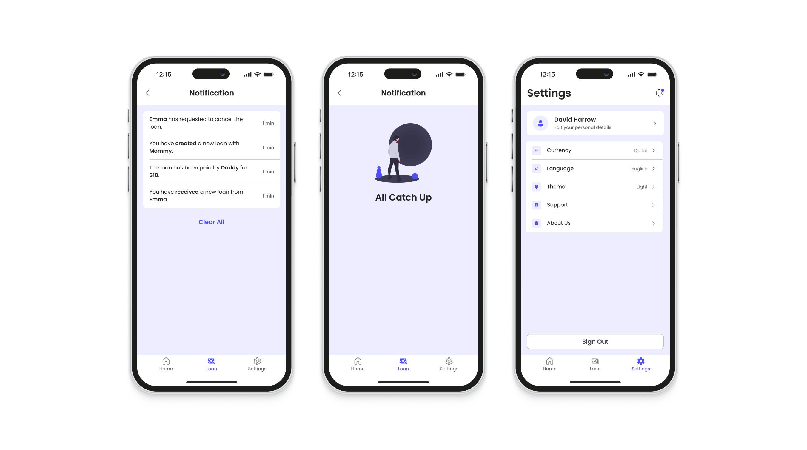Receive notifications for loan activities and reminders related to loan events. Access app settings to customize currency preferences, view app information, and manage accounts.