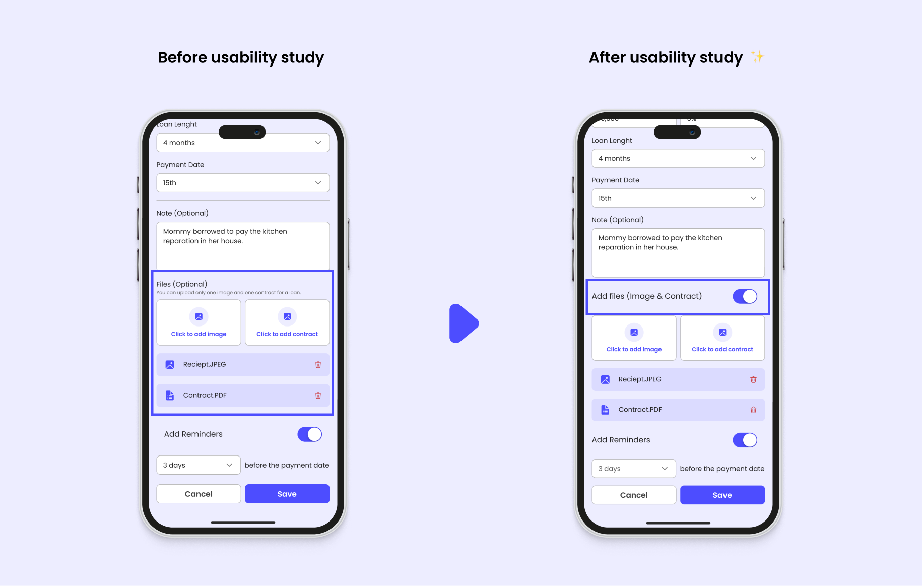Users felt it too crowded when inputting loan details. To address this, I added a toggle for users to optionally attach files like images and contracts, enhancing flexibility in the loan creation process.