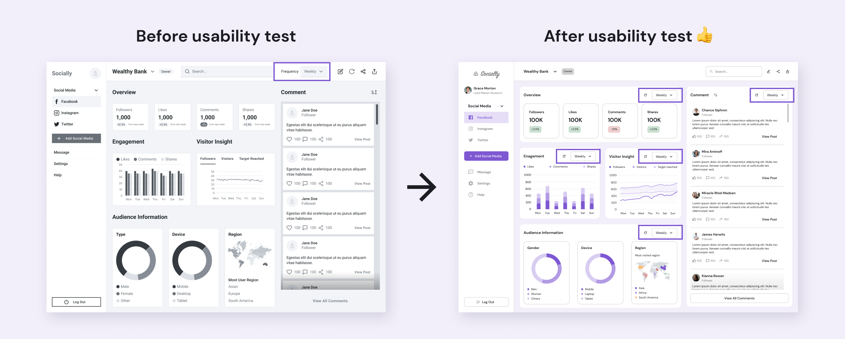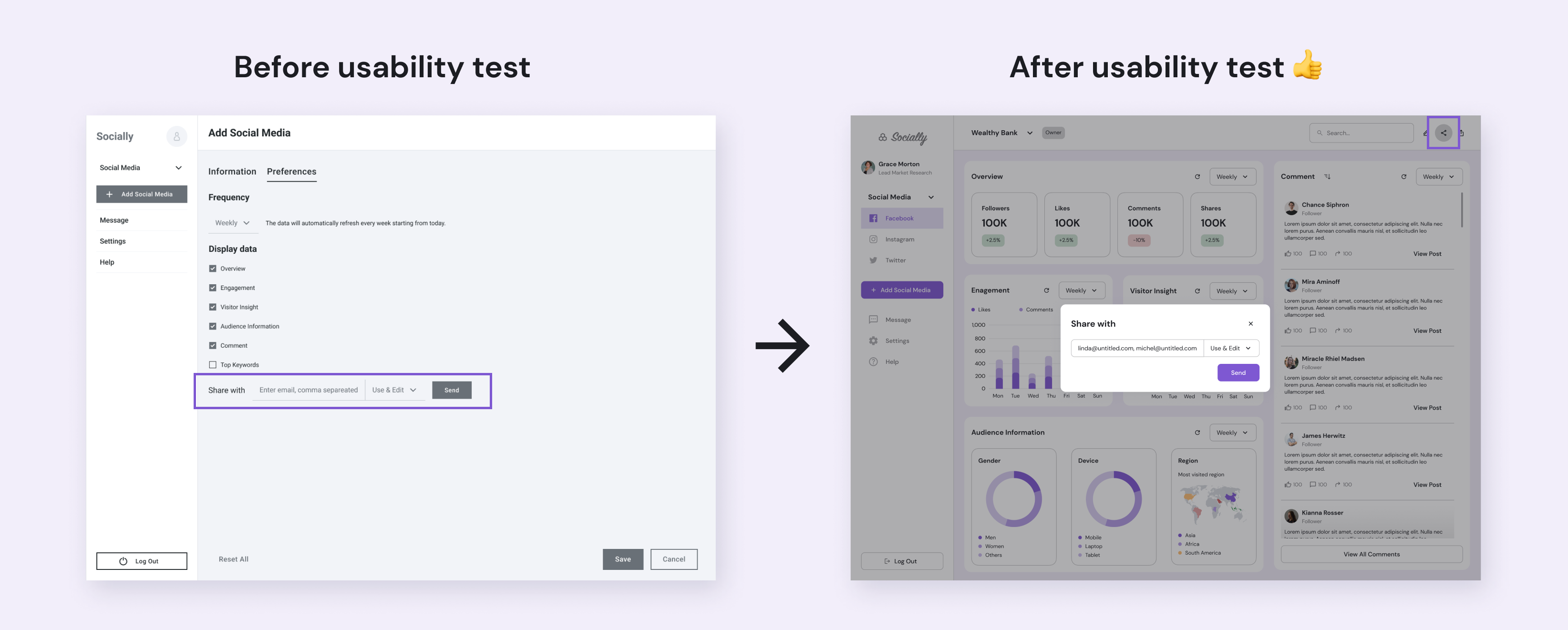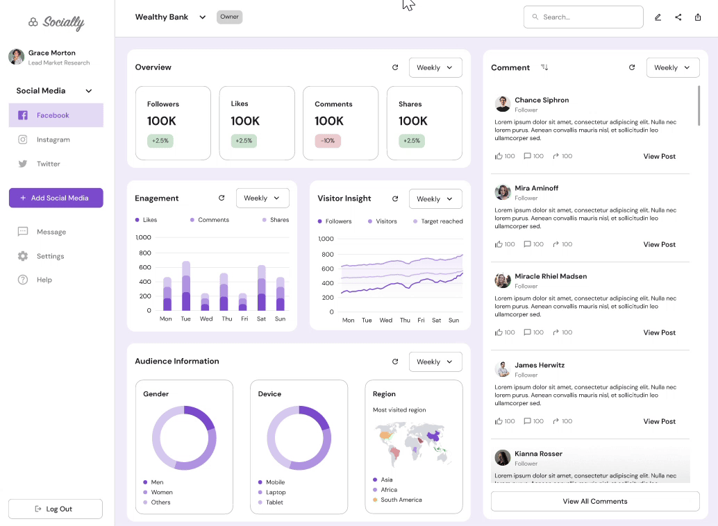 As a product designer on a cross-functional team, I led the UX research and design of a dashboard connecting multiple social media accounts, improving how marketing teams and business owners monitor, analyze, and share user insights